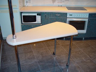 Поверхность такой стойки должна легко помещаться под столешницей одной из кухонных рабочих зон и плавно выдвигаться, благодаря особому поворотному механизму. Этот вариант очень удобен, поскольку позволяет значительно повысить функциональность пространства.