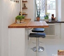 Складная барная стойка. Если в жилом помещении с маленькой кухней проживает многочисленная семья, то именно складная (раскладная) барная стойка станет оптимальным вариантом. В собранном состоянии такая конструкция выглядит, как небольшая тумбочка, помещающаяся в любом свободном углу (у стены), и ее поверхность вполне достаточна для перекуса в течение дня или чашки утреннего кофе.