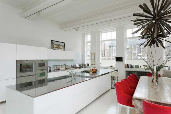 Зонирование белой кухни с помощью красных деталей