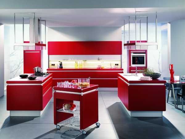 Красный островной гарнитур подходит для просторного помещения, экономит время передвижения, а не пространство. Островом в гарнитуре называется главный стол, который может быть вспомогательной рабочей поверхностью с раковиной или кухонной плитой, барной стойкой.