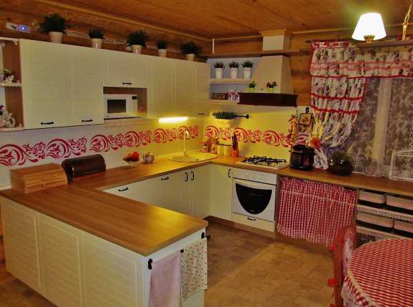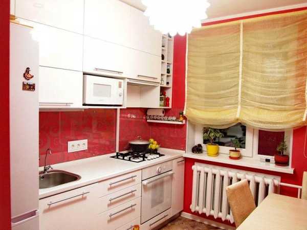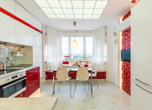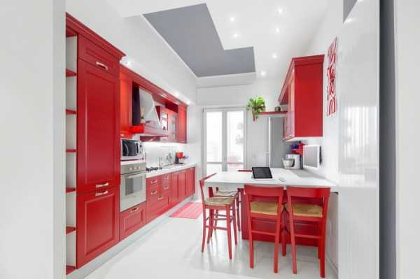 Белыми следует сделать стены, шторы (они могут быть с красным орнаментом), потолок, рабочие поверхности.