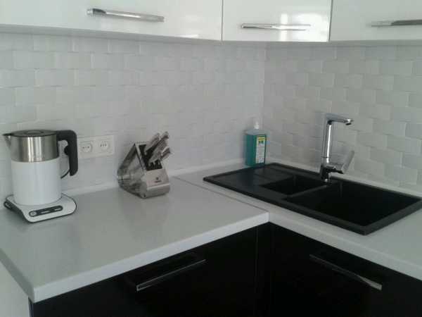 Можно остановить выбор на черном фартуке — он подчеркнет чистоту белого гарнитура.