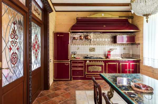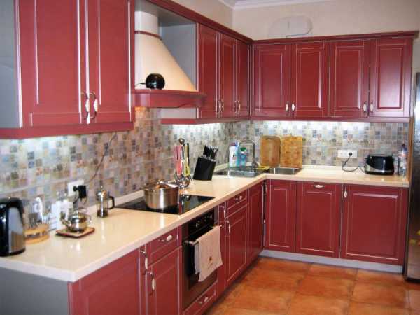 Кухонный красный гарнитур в бледном или темном оттенке с потертостями по старину, комбинируется с деревянной фурнитурой, коричневыми цветами фартука, столешницей из мозаики или массива.