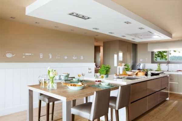 Для кухни стоит выбрать под оттенок пола или сделать его белым. Подойдут пластиковые панели, краска, обои, натяжной потолок, гипсокартон.