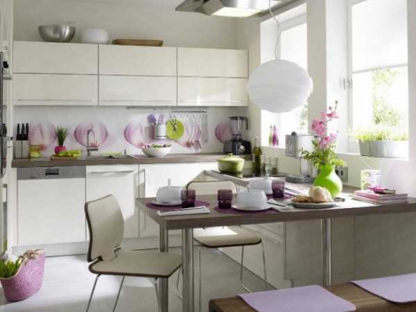 Такой вариант подойдет для оформления кухни в стиле «минимализм», «модерн», «хай тек» и «арт деко». В качестве материала для столешницы лучше всего использовать искусственный камень, закаленное стекло или пластик.
