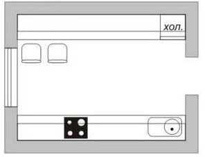 Параллельная планировка подходит для узких, вытянутых кухонь, с шириной более 2,3 метра. Кухонный стол в этом случае выносят в другую комнату или совмещают с гарнитуром.