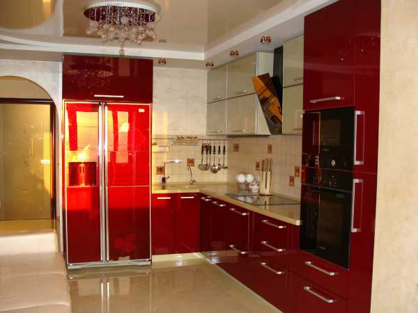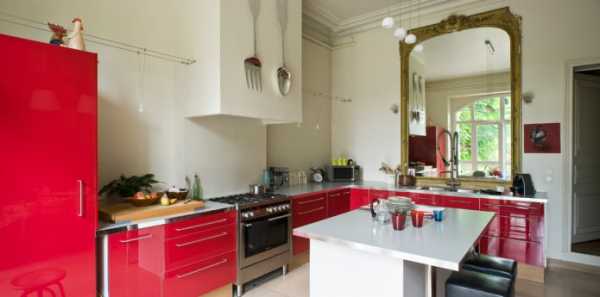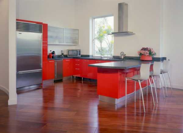 - Комбинировать в интерьере красный гарнитур с белым потолком, светлыми стенами и глянцевым полом.