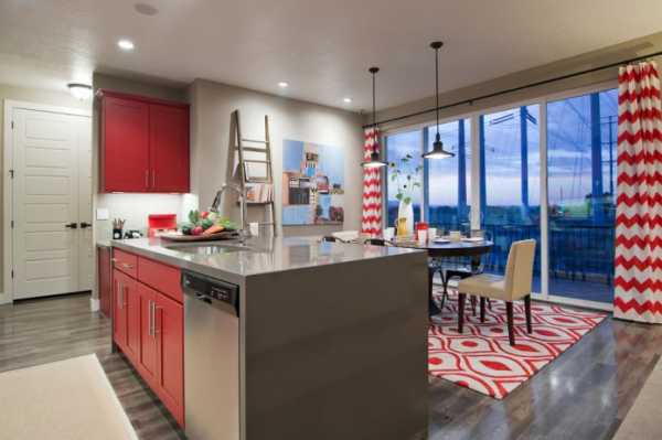 Стиль «модерн» — при его создании приветствуется обилие красного цвета. Желательно использовать глянцевые его варианты. Коралловые оттенки подойдут для фасадов, штор, декоративных элементов. Можно добавить несколько красных светильников, выполненных из стекла.
