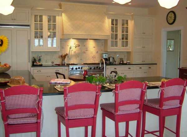 Белыми следует сделать стены и потолок, красный цвет должен присутствовать в текстиле — в виде красных клетчатых занавесок на окнах, клетчатой скатерти, небольшом коврике под обеденным столом. Красной может быть посуда и некоторая кухонная утварь (например, кастрюли, выставленные на видном месте).