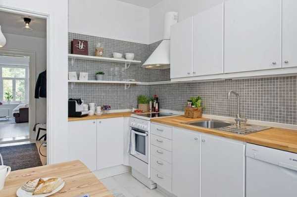 Можно предпочесть и более классический вариант — мозаичная плитка смотрится не менее хорошо, добавляя белой кухне красок, делая ее ярче и уютнее.