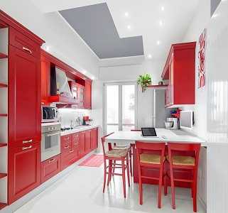 Отличное решение при обустройстве кухни, выполняющей одновременно роль столовой. Красными могут быть некоторые уровни подвесных потолков, столешница барной стойки. Красный цвет также должен присутствовать в элементах декора помещения.