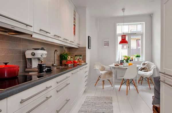 Если речь идет о совсем маленькой кухоньке, то здесь альтернативы нет: белый используется и в отделке, и в меблировке.