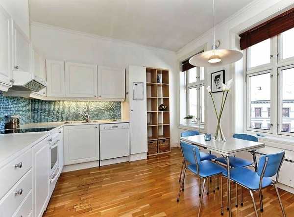Белый цвет при обустройстве кухни очень часто выбирают для того, чтобы расширить пространство и облегчить его. В таком случае, уместно будет использовать легкую не массивную мебель, можно с открытыми полками. Неплохо в данном интерьере будут выглядеть стенды со стеклянными элементами — они наполнят кухню светом, сделают ее невесомой и просторной.
