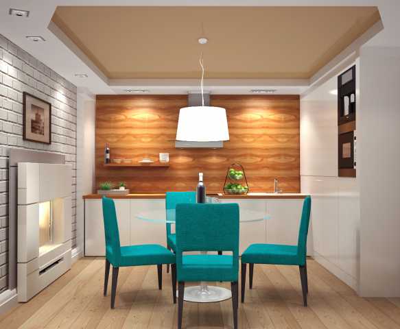 На фото — верх помещения: зонирование с помощью уровней потолка.- Эффективному разделению пространств служит пол: кухонная часть покрывается кафелем, искусственным камнем или линолеумом, гостиная – древесными материалами. Дерево – более «капризный» материал. В кухне же к покрытию пола предъявляются более высокие требования относительно практичности.