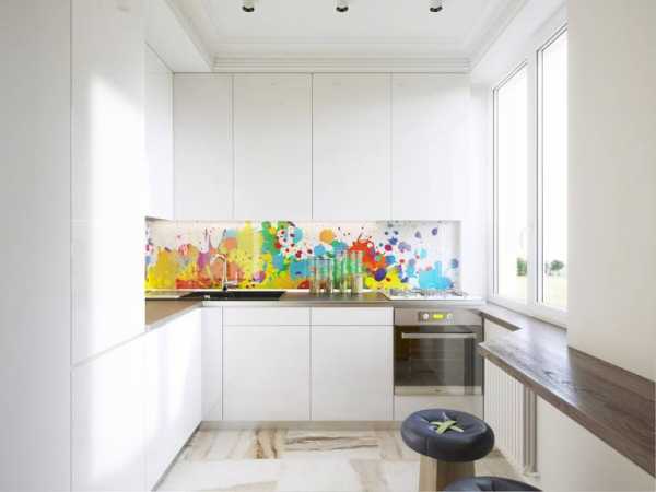 Если кухонный гарнитур полностью белый, стоит оборудовать яркий фартук, используя для этого цветную мозаику.