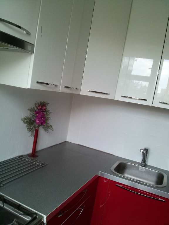 Красные глянцевые фасады в сочетании с белой плиткой помогут создать яркий интерьер, который подойдет молодым людям.