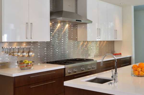 На фото – зеркальная отделка на кухне. - Металл. Сталь, как правило, используется чаще, хотя встречается и медь. Стальная мозаика привлекательна за счет своей исключительной прочности и долговечности, а декоративность ей обеспечивает обработка поверхности.