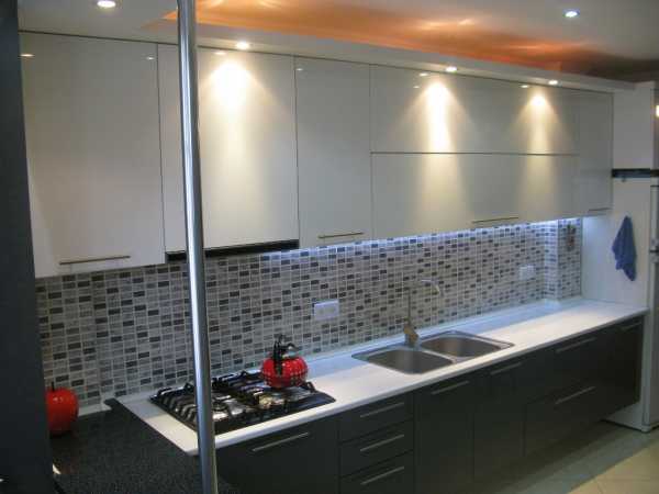 — Множество цветовых решений, благодаря чему можно подобрать мозаичный фартук под любой цвет кухни, сделать переход от нижнего яруса к верхнему в двухцветном гарнитуре или создать яркий акцент в помещении;