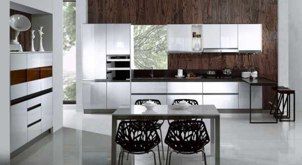 Идеальным вариантом будет встроенные шкафы и бытовые приборы. Из фурнитуры – легко открываемые дверцы шкафчиков, от легкого нажатия. Отделка из глянцевых материалов, гладкая и блестящая, например, пленка пвх, пластик, акрил, эмаль.