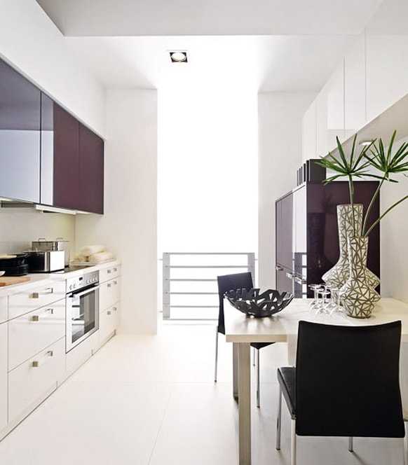 - двухрядная, при которой кухонные шкафы и техника располагаются друг напротив друга вдоль двух стен, а для обеденной зоны отводится место посередине.