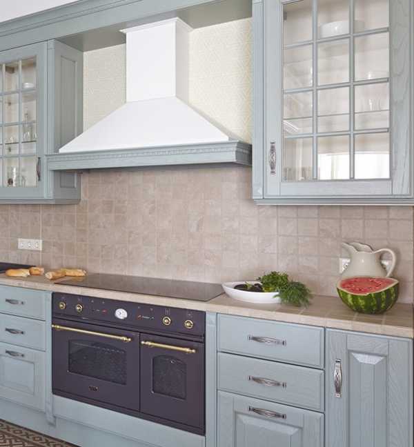 Прямая кухня в стиле прованс с отделкой фасада шпоном бирюзового оттенка