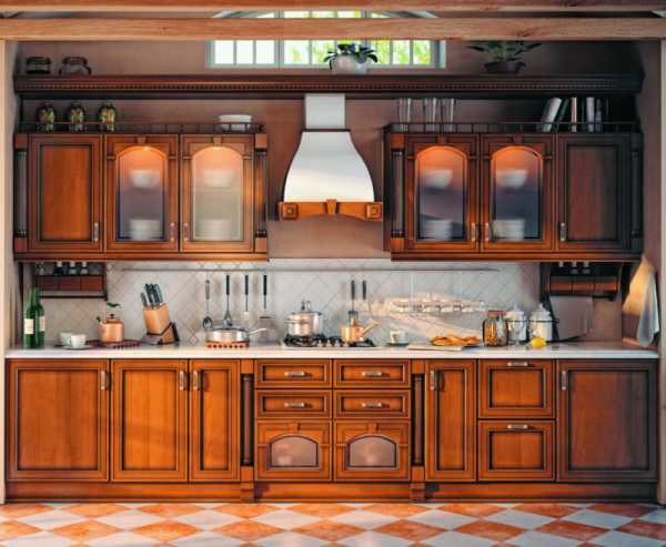 - Классический стиль подходит для просторных помещений. Он придает любому интерьеру царственности и величественности. Кухонные гарнитуры отличаются узорчатыми рисунками на фасадах, винтажными стеклами.