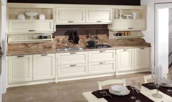 Бежевая линейная кухня тяготит к классике, привнося в интерьер спокойные, плавные нотки. Чаще всего, ее выбирают уверенные люди. Палитра бежевого подразделяется на песочный, пшеничный, молочный, кофейный и карамельный тон, каждый из которых интересен по – своему.