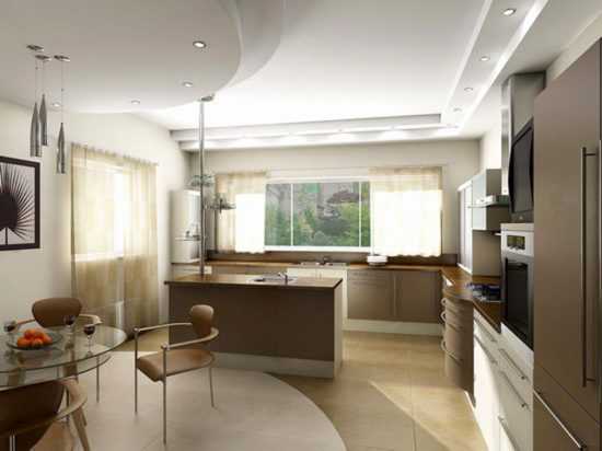 На фото — проект с нестандартной установкой барной стойки в кухне площадью 16 кв. м.В более просторной комнате – около 20 квадратных метров – интересно будет смотреться выделение обеденной зоны подиумом или конструкцией на потолке. Разноуровневые решения сделают проект в любом стиле гармоничным, так как зоны будут визуально разделены, что делает пространство комфортным. Поддержать композицию в этом случае можно с помощью похожих конструкций над рабочей зоной. Органичной будет подсветка для дополнительного выделения зон.