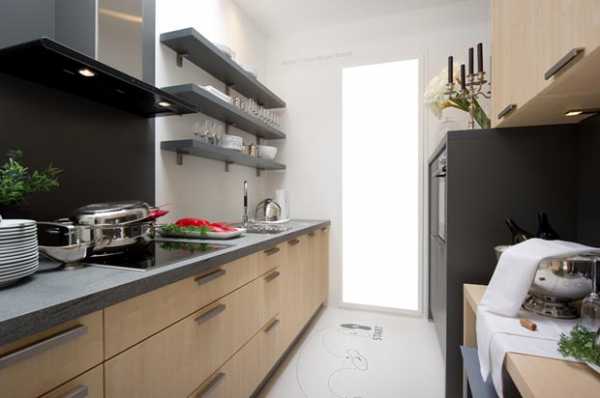 - Параллельная планировка. В этом случае задействованы лишь 2 противоположные стены. С одной стороны размещается рабочий треугольник (раковина, печка, разделочный стол) с гарнитуром, а возле стены напротив устанавливается диван (возможно со столом).