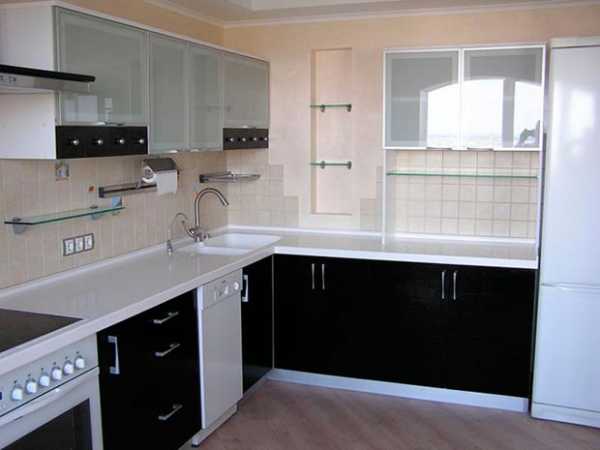 Холодильник можно установить на одном из углов гарнитура. В конце другого угла можно расположить шкафчик или пенал с точно такой же высотой, тогда планировка будет выглядеть более гармонично.