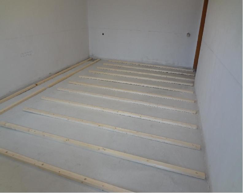 - Далее выполняется монтаж лаг. На рынке имеются саморегулирующиеся системы, но можно произвести сборку каркаса из заранее приобретенных брусьев размером 4х10 сантиметров. Такая конструкция представляет собой некое подобие обрешетки с заранее определенной высотой (нулевой уровень), на которую будет укладываться ламинат.
