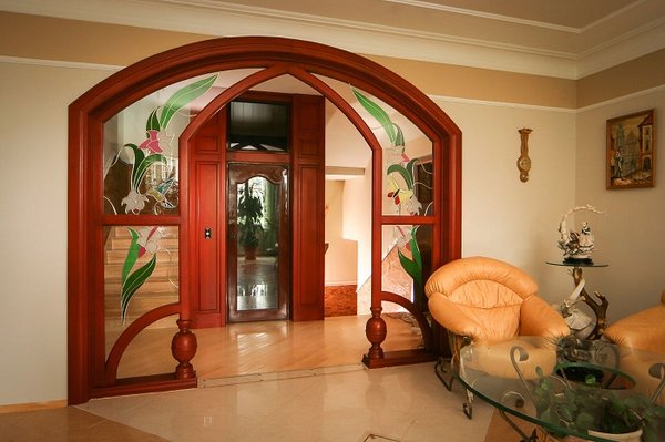 Арочные конструкции часто украшают цветным стеклом или мозаикой. Их принято оформлять и с помощью витража. Эта конструкция будет смотреться очень ярко и эстетично. Причём мозаика или витраж могут украшать как всю арку, так и её отдельные элементы.