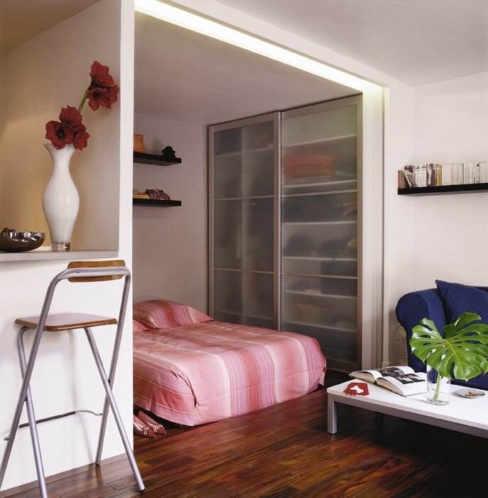 Спальню, площадью всего 2,5-4,5 кв. м. также располагают в алькове. Здесь ставят кровать, иногда маленькую тумбочку. Для создания приватной комнатки, выполняют раздвижные двери, вешают плотную занавеску.
