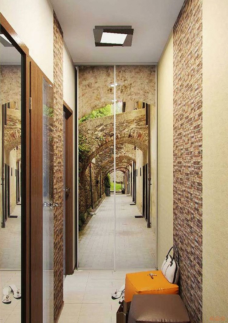 Зеркальные двери шкафа-купе и подсветка по карнизу зрительно расширит имеющееся пространство. Если шкаф будет расположен по всей длине коридора, то в центре можно сделать нишу под зеркало от пола до потолка. Такой вариант удобно смотрится напротив арки гостиной. Создается впечатление, что это не зеркало, а вход в еще одну комнату.