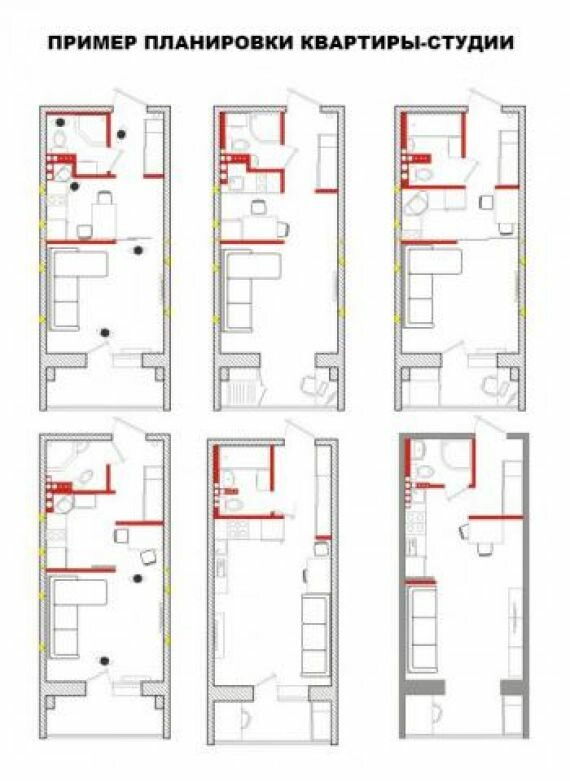| Возможностями перепланировки. | Внутренние перегородки удачно делят помещение на несколько зон. Тогда студии станут больше похожи на стандартные варианты квартир. |