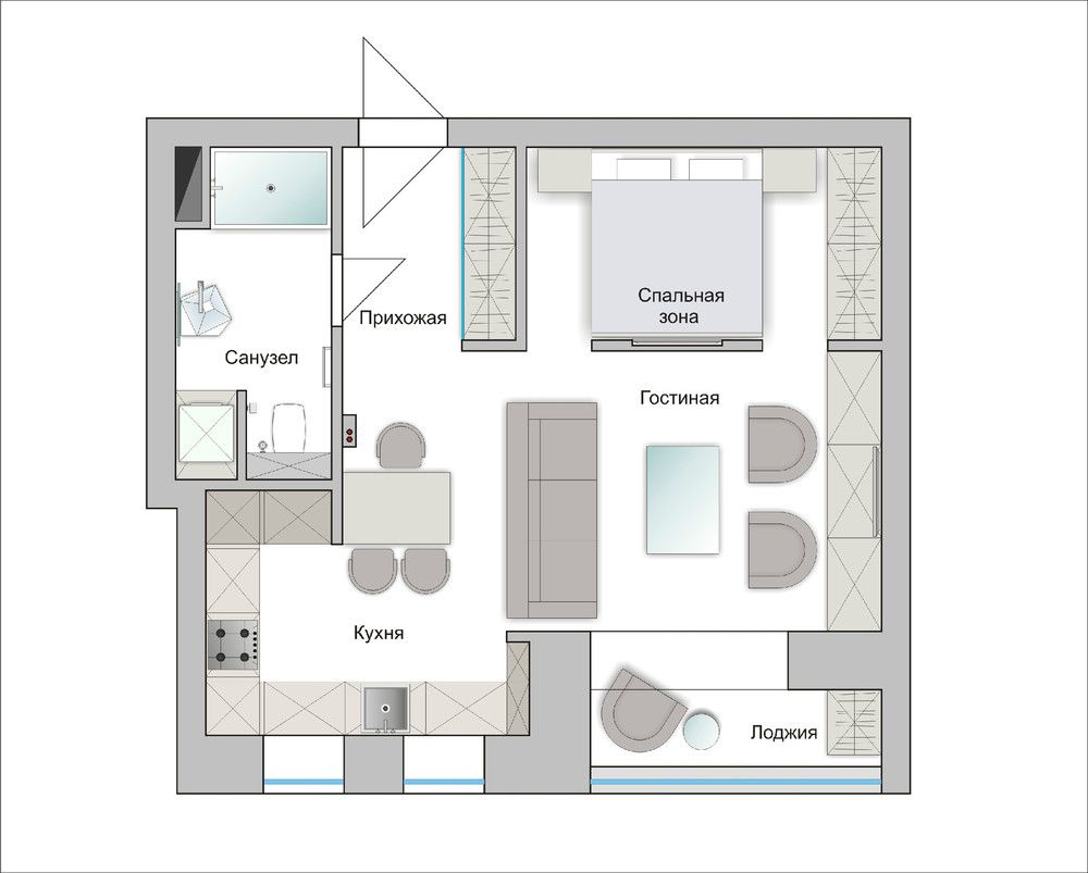 Дизайн однокомнатной квартиры 38 метров после перепланировки