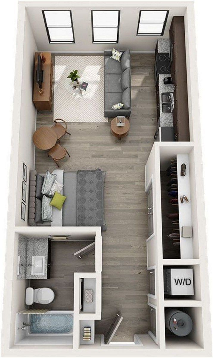 Некоторые планы квартир-студий предусматривают место для штабелированной стиральной машины и сушилки — возможно, в туалете, ванной или даже на кухне. У других может быть пальто или бельевой шкаф. Чтобы обеспечить максимальное пространство для хранения, поищите план этажа с гардеробной рядом с местом, где вы установите кровать.