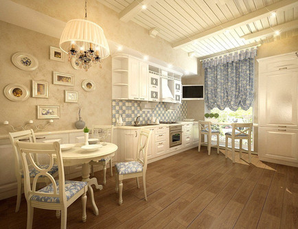 Наиболее часто используется белый. Крашеная деревянная мебель, обивка сидений, посуда, отделка потолка и стен. Этот фон замечательно оттеняют голубые вкрапления текстиля или декоративных элементов.