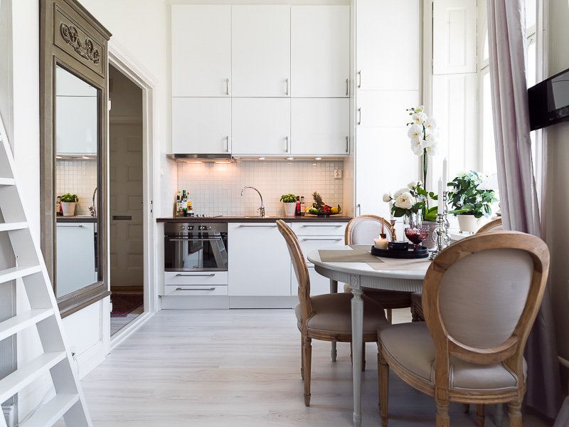 Любители природных материалов могут оформить студию в эко-стиле, добавив деревянных текстур (натуральная мебель, ламинат «под дерево»), а ценители французского уюта – обустроить квартиру в стиле прованс, с цветочными узорами и гарнитуром под старину.