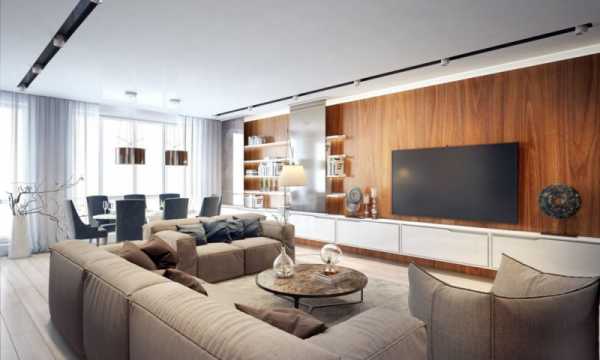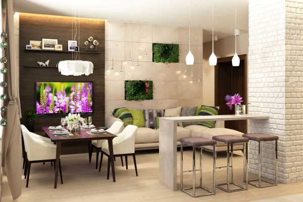 Конечно, ни одна зона отдыха не будет полноценной без такого предмета, как телевизор. Его рекомендуется разместить на стенке так, чтобы можно было смотреть с гостиной и кухни. Для этого используйте поворотные конструкции.