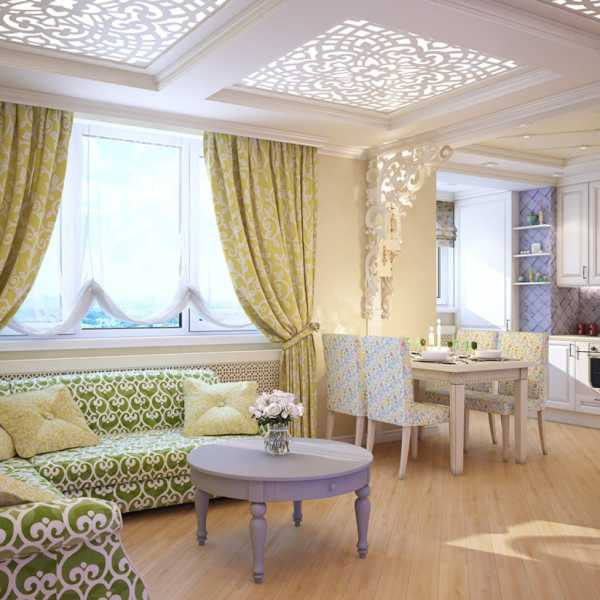 Гостиную в основном оформляют небольшим удобным диваном, предпочтительно в светлых оттенках, журнальным столиком, комодом, креслами или пуфиками. В дизайне не применяют крупные и слишком громоздкие предметы и большое количество украшений. Здесь гораздо уместнее использование встроенных конструкций и небольших ярких акцентов, в виде такого декора, как подушки, пледы, покрывала или шторы.