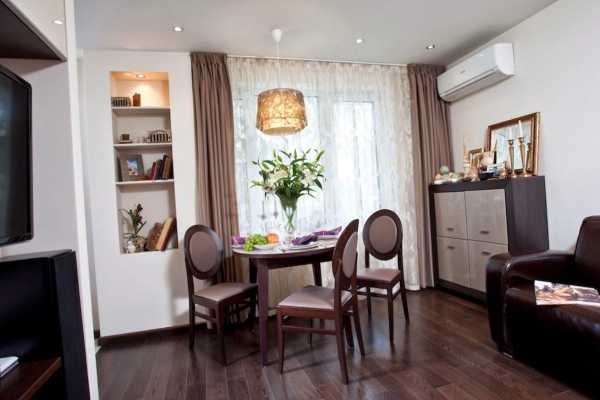 Отличной практичной столешницей, может стать переоборудованный подоконник, а барная стойка послужит прекрасной заменой обеденному столу. При наличии ниши, в ней можно оборудовать кухню или разместить раскладной диван, предоставляющий дополнительное спальное место.