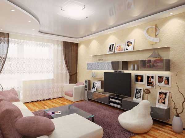 - Зона для отдыха. Вместо массивных кресел, можно использовать не менее удобные пуфы, бескаркасную мебель и тканые кресла-мешки. Такой вариант обеспечивает комфортный отдых, а данная мебель не занимает много места. Таким образом, гостиная будет максимально светлой и просторной. Для придания дополнительного уюта, устелите зону отдыха небольшим ковриком, установите телевизор, аквариум, живые растения, небольшой туалетный столик;