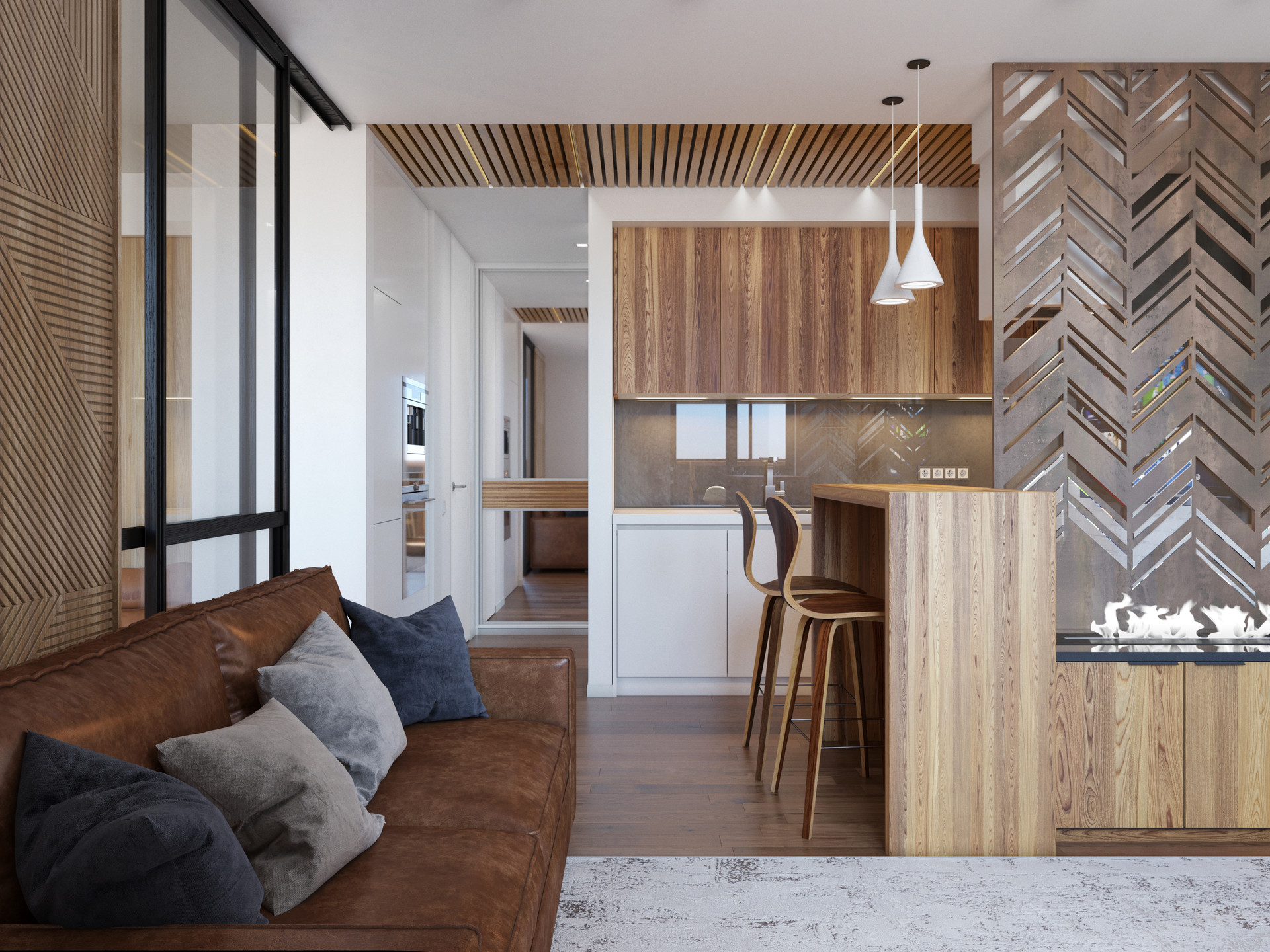 Для разделения кухонной зоны и гостиной можно использовать деревянную или искусственную небольшую перегородку, которая может подойти для установки телевизора. Или прозрачную стеклянную, которая будет смотреться оригинально и привнесет современный элемент, подчеркивающий выбранный дизайн.