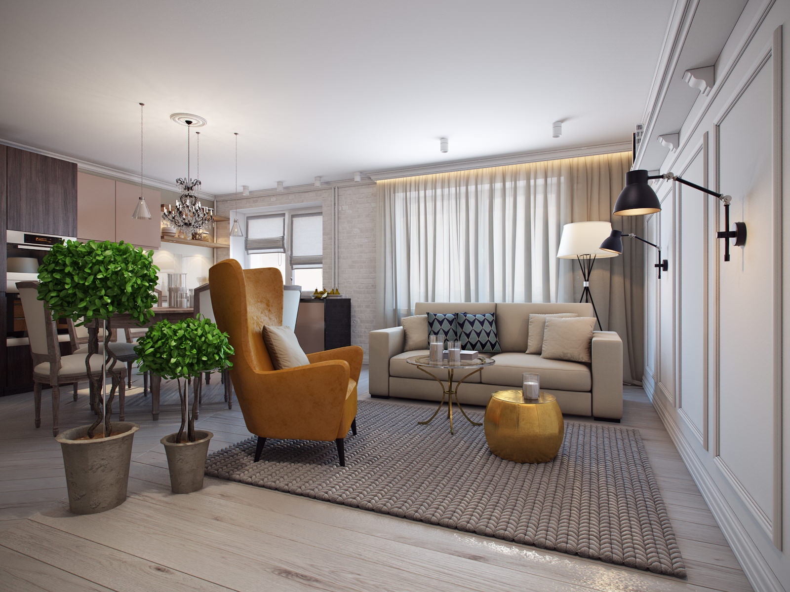 Современный дизайн 3-х комнатной квартиры на 80 кв. м. подразумевает наличие большой люстры в зоне гостиной.