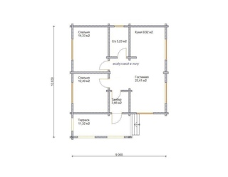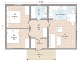 В этом случае в плане появляется небольшой тамбур, рядом с ним (по одну сторону холла) находится гостиная, по другую — кухня. Санузел размещают в конце коридора, за спальнями.