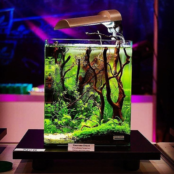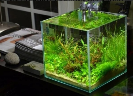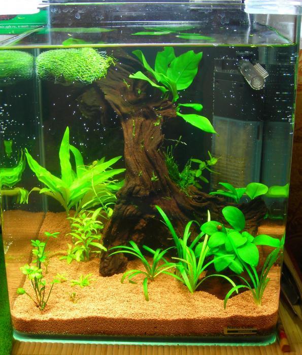 Дизайн аквариума воспроизводит небольшой участок дна в емкости. Чтобы создать гармоничную композицию, надо кропотливо подобрать биологическую среду.
