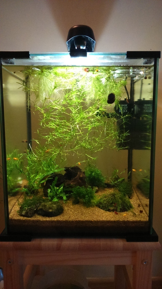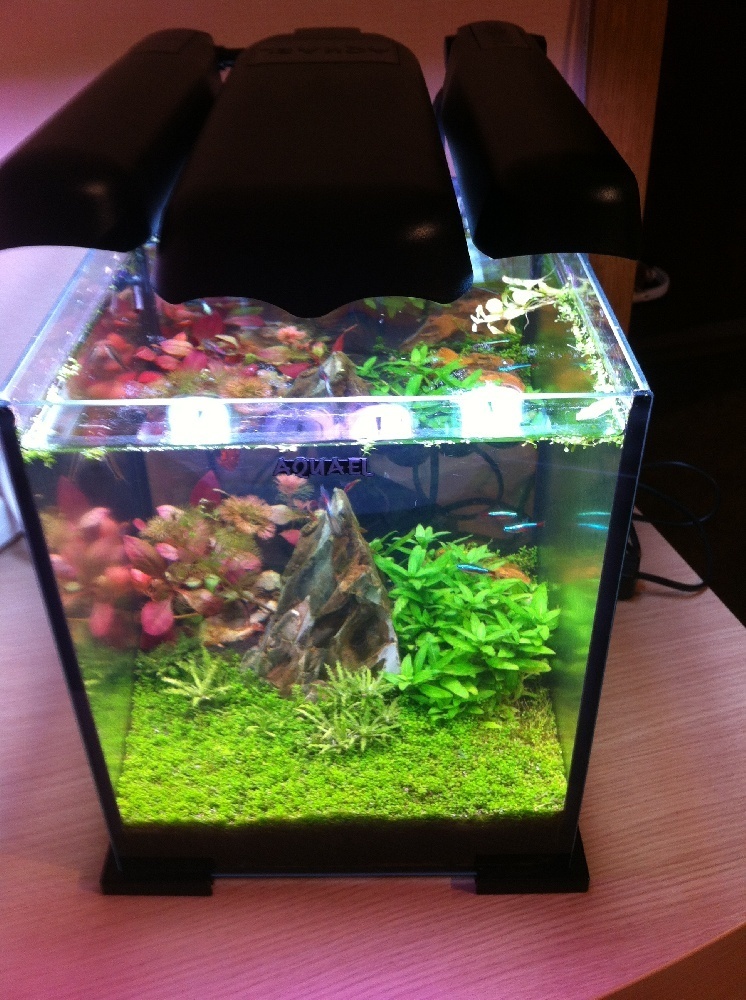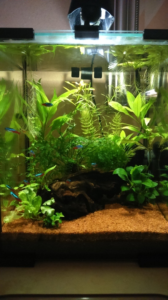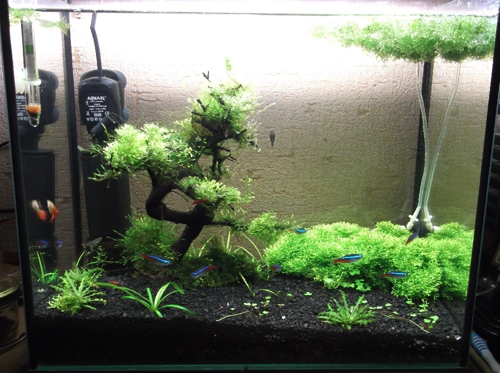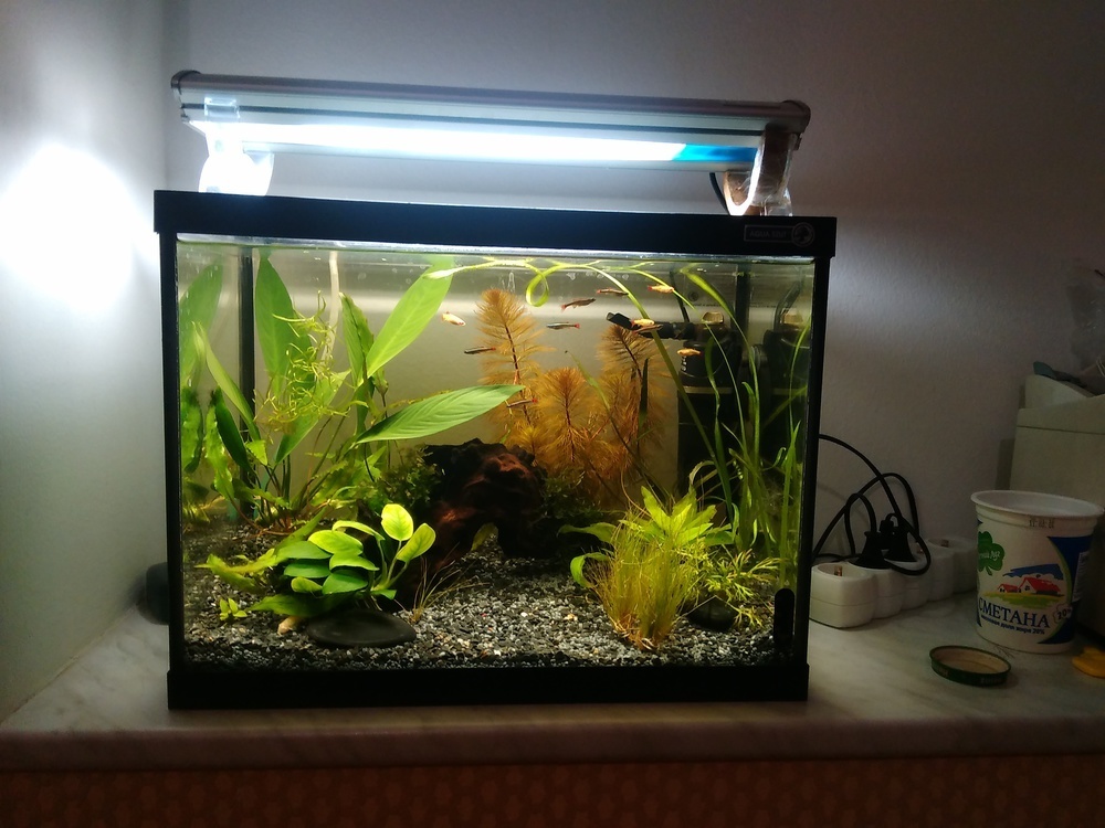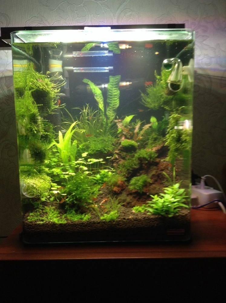 Трехмесячный аквариум воссоздает зелень Карпатской долины. В дополнение к разнообразным растениям, есть четыре вида рыб, в том числе светящаяся тетра и креветка амано. все4аквариум.ru