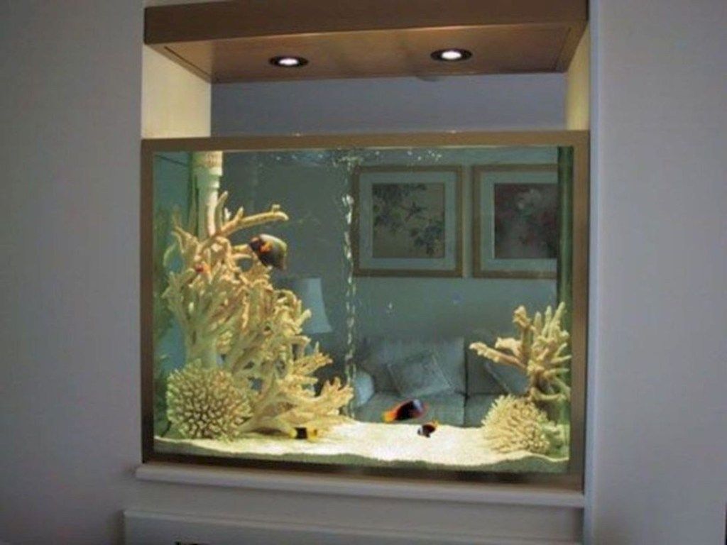 - Аквариум, установленный в нише межкомнатной перегородки может выглядеть с одной стороны, как живой элемент большого шкафа, а с другой стороны, как живая картина, встроенная в стену.