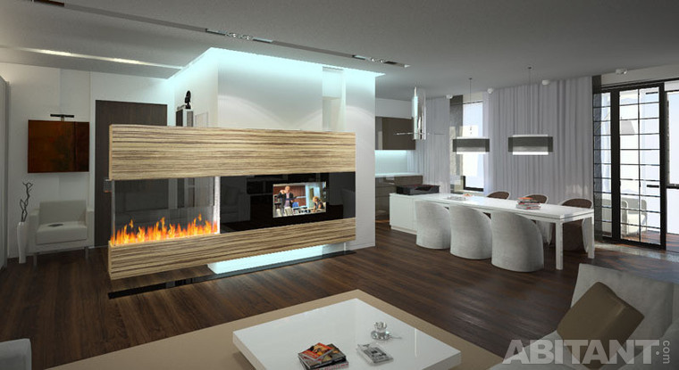 Каминная зона гостиной. Мебель, B&B Italia; биокамины, Planika; аксессуары, Moon-Stores. Стена дымохода покрыта декоративной штукатуркой, на которой сымитированы следы бетонной опалубки.
